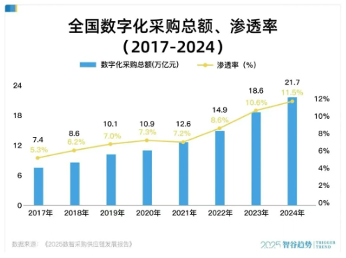 增长更迅猛的,是全国数字化采购的渗透率,一路从2017年5.3%跃升至2024年的11.5%,翻了一倍以上。