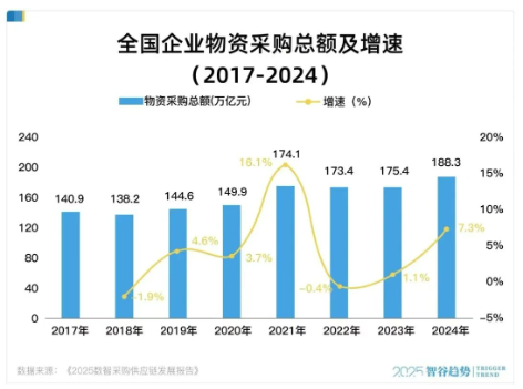 2024年,全国企业物资采购总额突破188万亿,同比增长7.3%,再创历史新高。