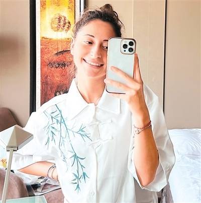 索菲娅试穿带有中国竹叶元素的服饰。